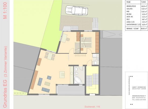 Der Hauptzugang erfolgt über die Eschenstraße. Darüber hinaus gibt es einen weiteren Eingang von der Stellplatzseite her. Dieser ist über die Straße Rott erreichbar.