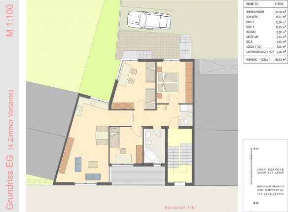 Der Hauptzugang erfolgt über die Eschenstraße. Darüber hinaus gibt es einen weiteren Eingang von der Stellplatzseite her. Dieser ist über die Straße Rott erreichbar.