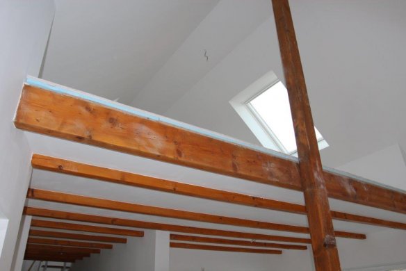 Deckenbalken mit Blick aus dem Wohnraum hoch in die Galerie